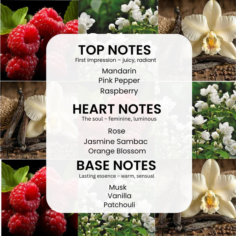 It opens with vibrant notes of exotic passionfruit and citrus, instantly awakening the senses with freshness and allure. The heart reveals a bouquet of peony and jasmine — soft, romantic, and full of feminine grace. As the scent settles, warm vanilla and subtle musk emerge, leaving a flirty and lasting impression that’s both sweet and sophisticated.