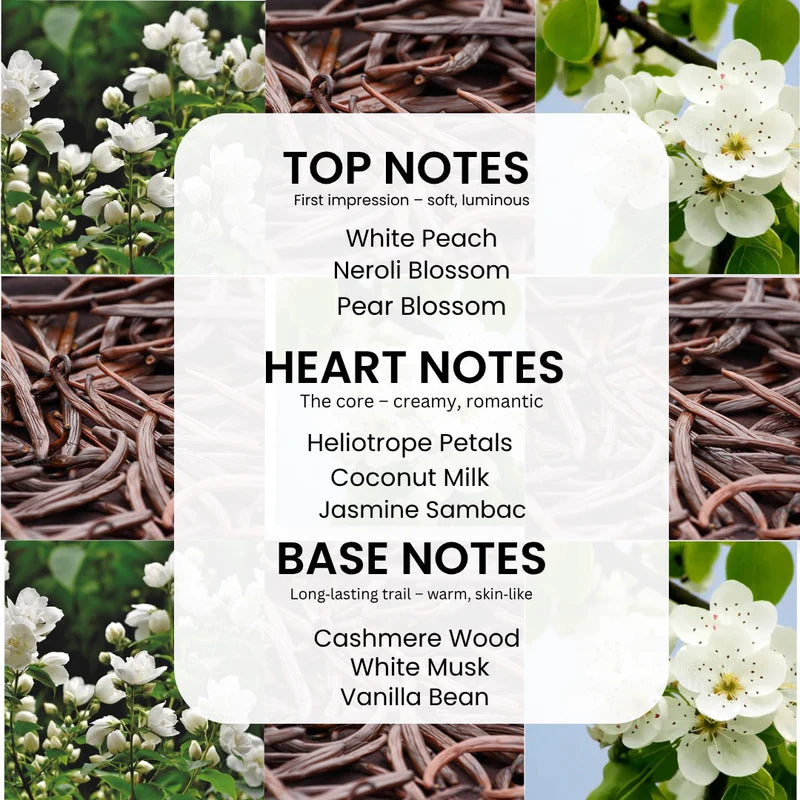 The scent opens with fresh fruity notes that sparkle with innocence and sweetness. As it settles, a tender heart of white florals and soft petals adds a dreamy, romantic character. Finally, a gentle base of vanilla and skin musk wraps the scent in warmth and sensuality — leaving behind a trail that feels like a soft whisper on the skin.